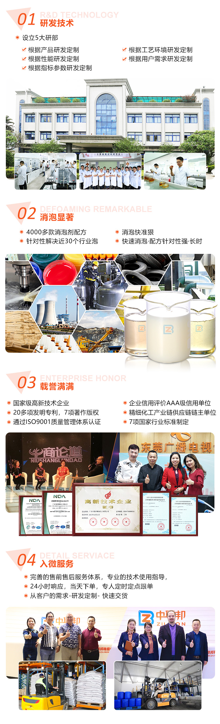 在2017年,曾受CCTV牛商論道專訪企業(yè),同年曾受東莞電臺《歲月留聲》欄目專訪。到目前為止,已研發(fā)4000多款消泡劑生產(chǎn)配方,針對性解決了近30個行業(yè)的泡沫難題。主要的消泡劑應(yīng)用行業(yè)有:水處理工業(yè)、金屬加工液、工業(yè)清洗、水性涂料、采礦選礦、造紙工業(yè)、水性粘合劑、發(fā)酵、油田、電池新能源、紡織印染、萃取工業(yè)、建筑材料、油墨油漆、電廠脫硫、泥漿工業(yè)、農(nóng)業(yè)等領(lǐng)域。